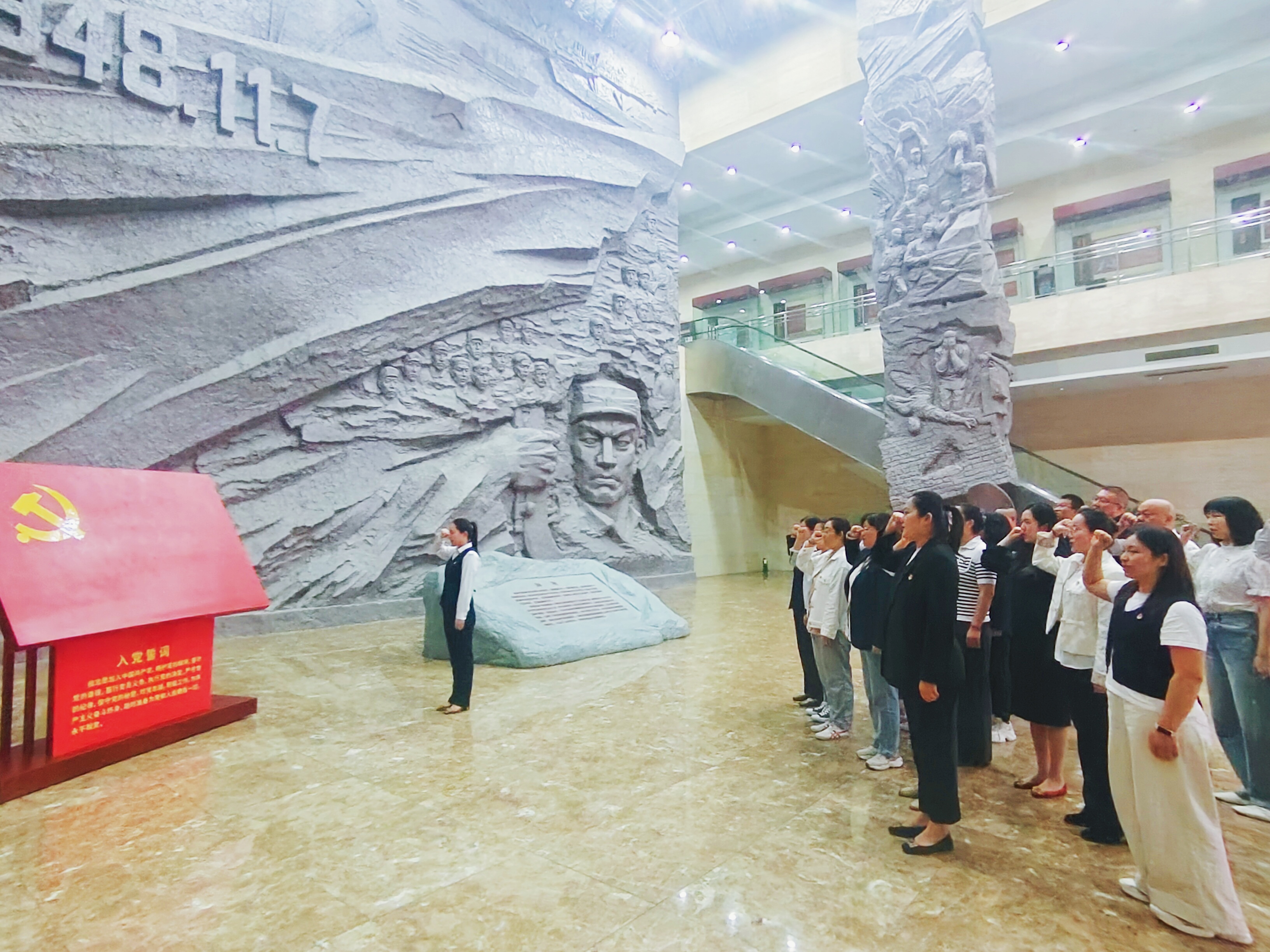 參觀接近尾聲,全體黨員在紀念館內的黨旗前整齊列隊,舉起右拳莊嚴宣誓,重溫入黨誓詞。“我志愿加入中國共產黨,擁護黨的綱領,遵守黨的章程……”鏗鏘有力的誓言回蕩在展廳內,不僅是對入黨初心的再次叩問,更是對傳承紅色精神、踐行使命擔當的鄭重承諾。