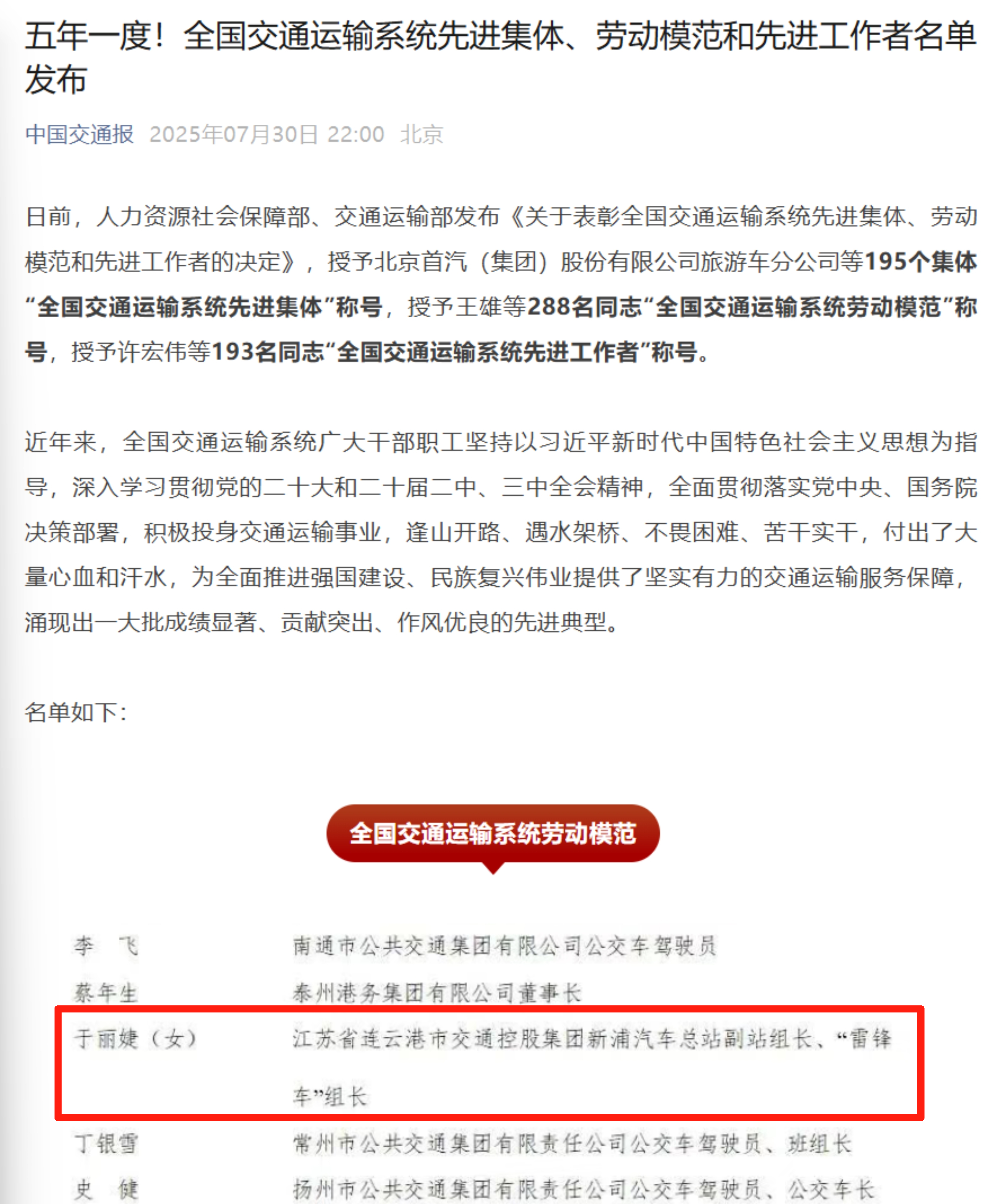 近日,人力資源社會保障部、交通運輸部聯合發布表彰決定,連云港市交通控股集團新浦汽車總站副站長、“雷鋒車”組組長于麗婕榮獲全國交通運輸系統勞動模范稱號。