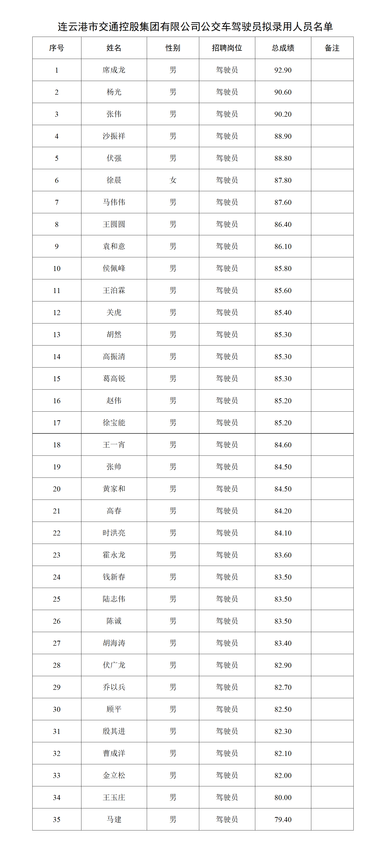 根據連云港市交通控股集團有限公司公交車駕駛員招聘公告有關規定和要求,現將本次招聘擬錄用人員名單予以公示。