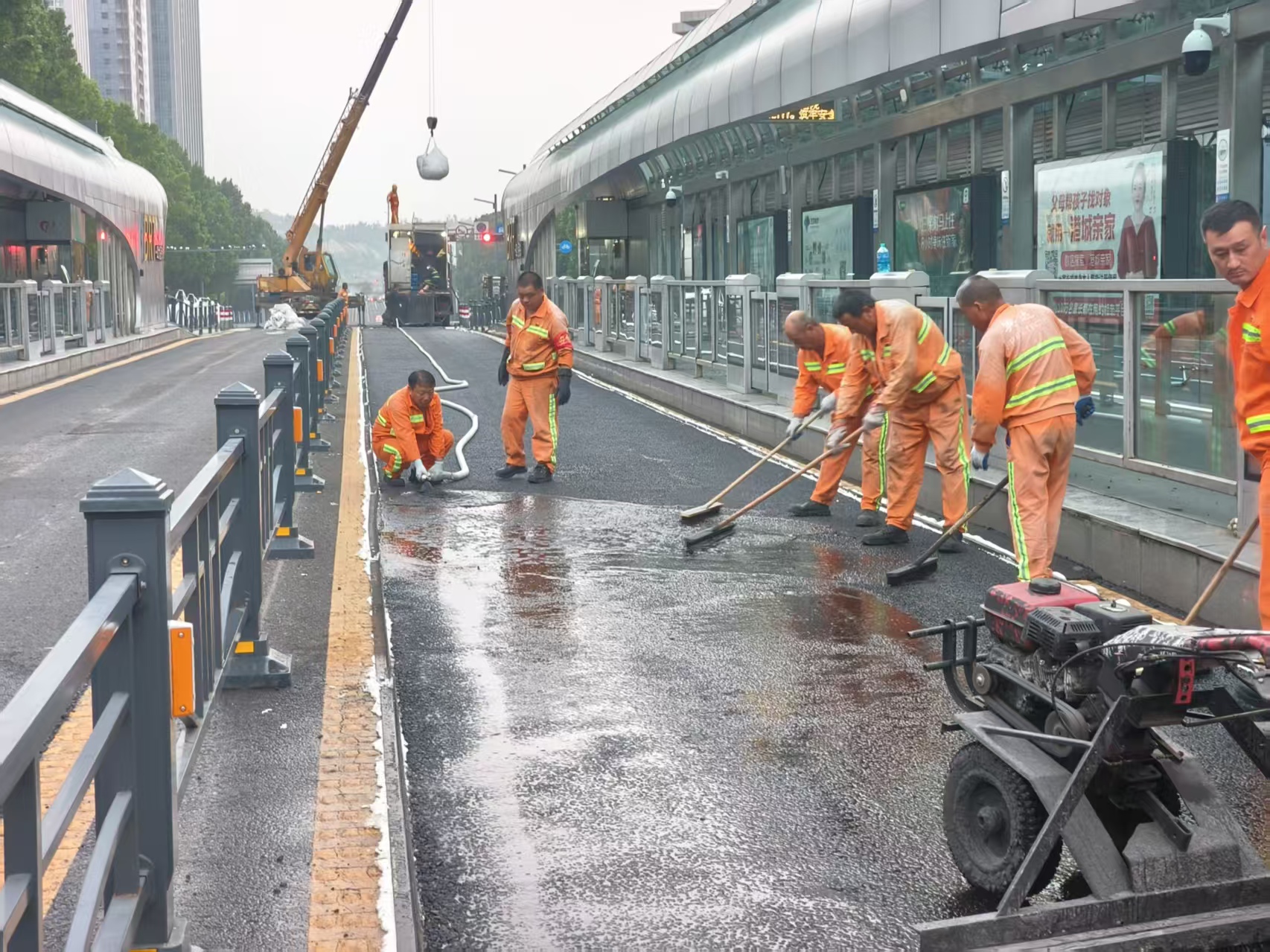 在港城BRT公交站臺專用車道養(yǎng)護項目中,董入龍創(chuàng)新工作室再次扛起“創(chuàng)新大旗”。公司管養(yǎng)的84個BRT公交站臺60米范圍專用車道,因客流量大、車輛??款l繁,路面車轍病害嚴重,傳統養(yǎng)護難以兼顧效率與質量。工作室成員共同研判后,選取人流密集的一四九站、墟溝購物中心站及西園路站作為試點,引入“灌注式半柔性路面技術”。為確保技術落地,董入龍帶領團隊開展20余次模擬試驗,精準把控材料攤鋪厚度、壓實溫度等核心參數;施工期間,他創(chuàng)新采用“分段作業(yè) + 錯峰施工”模式,協調公交部門調整臨時停靠點,最終僅用72小時便完成3個站臺專用車道的病害整治。經后期跟蹤觀測,試點路段路面平整度、抗滑性能均達到優(yōu)質標準。