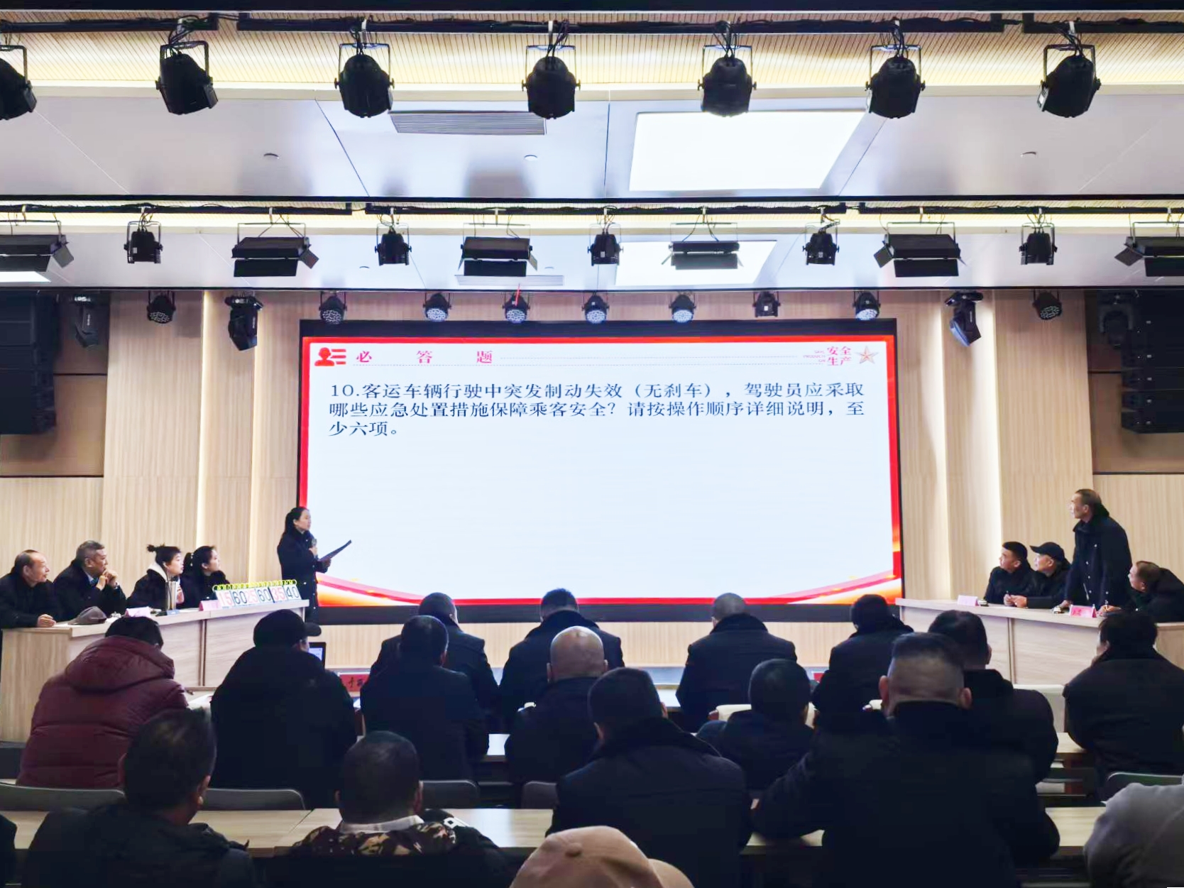 競賽設置了必答題、搶答題和觀眾互動題三個環節,內容涵蓋安全生產法規、規范駕駛操作、應急處置流程等實用知識。現場氣氛緊張而熱烈——在必答題環節,選手們穩扎穩打、對答如流,展現出扎實的知識功底;搶答題環節則節奏緊張、扣人心弦,各隊反應迅速、積極搶答,將團隊協作能力與臨場應變能力展現得淋漓盡致。觀眾互動環節更是點燃全場熱情,在場人員踴躍參與、積極作答,在趣味比拼中進一步鞏固了安全知識。經過多輪激烈角逐,最終三支隊伍憑借出色表現脫穎而出,分獲競賽一、二、三等獎。