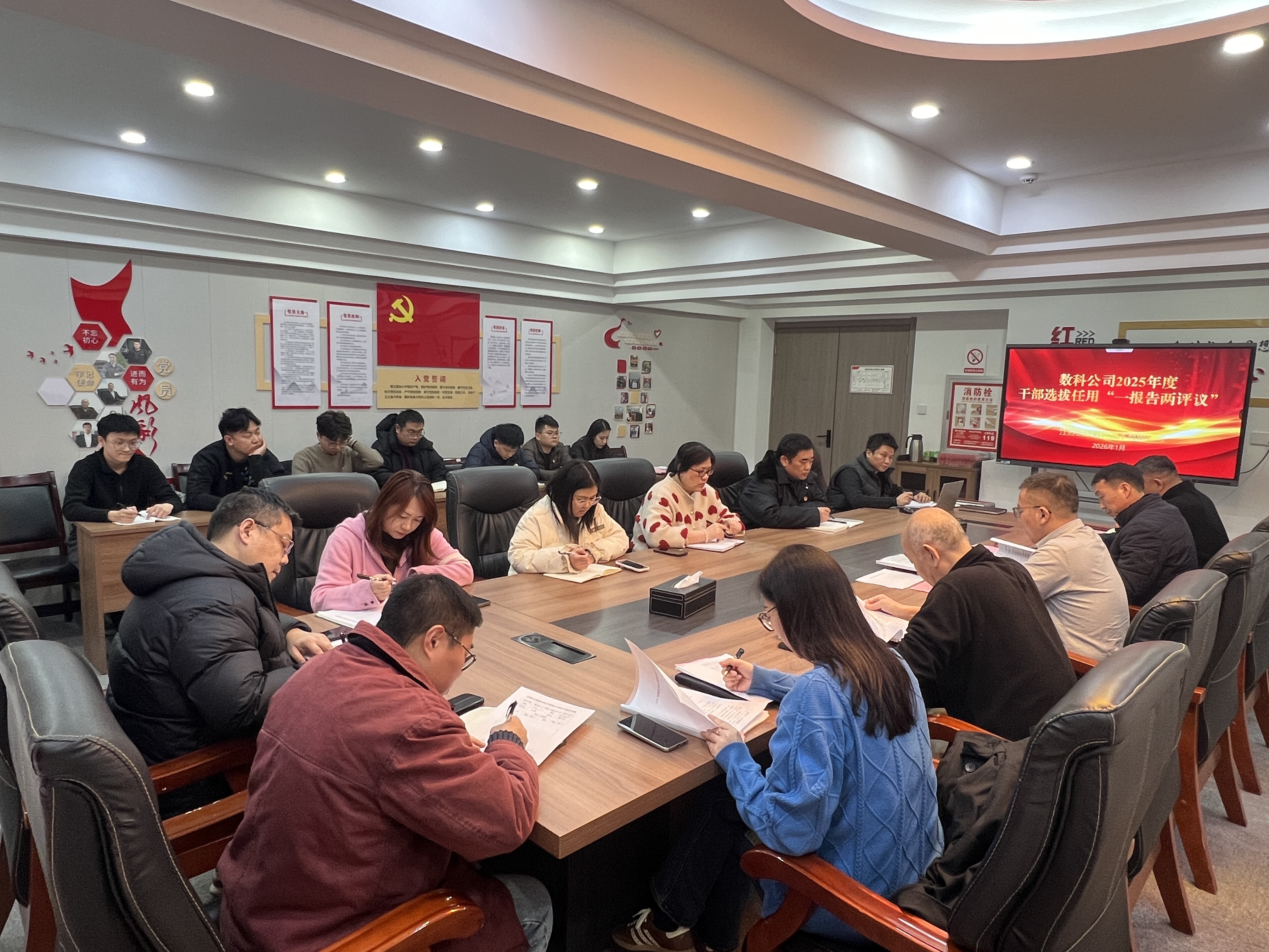 近日,數科公司2025年度干部選拔任用“一報告兩評議”暨述職評議會議在黨員活動室召開。公司領導班子成員、中層干部及部分黨員職工代表參會,會議由數科公司支部書記、工會主席王冰主持。