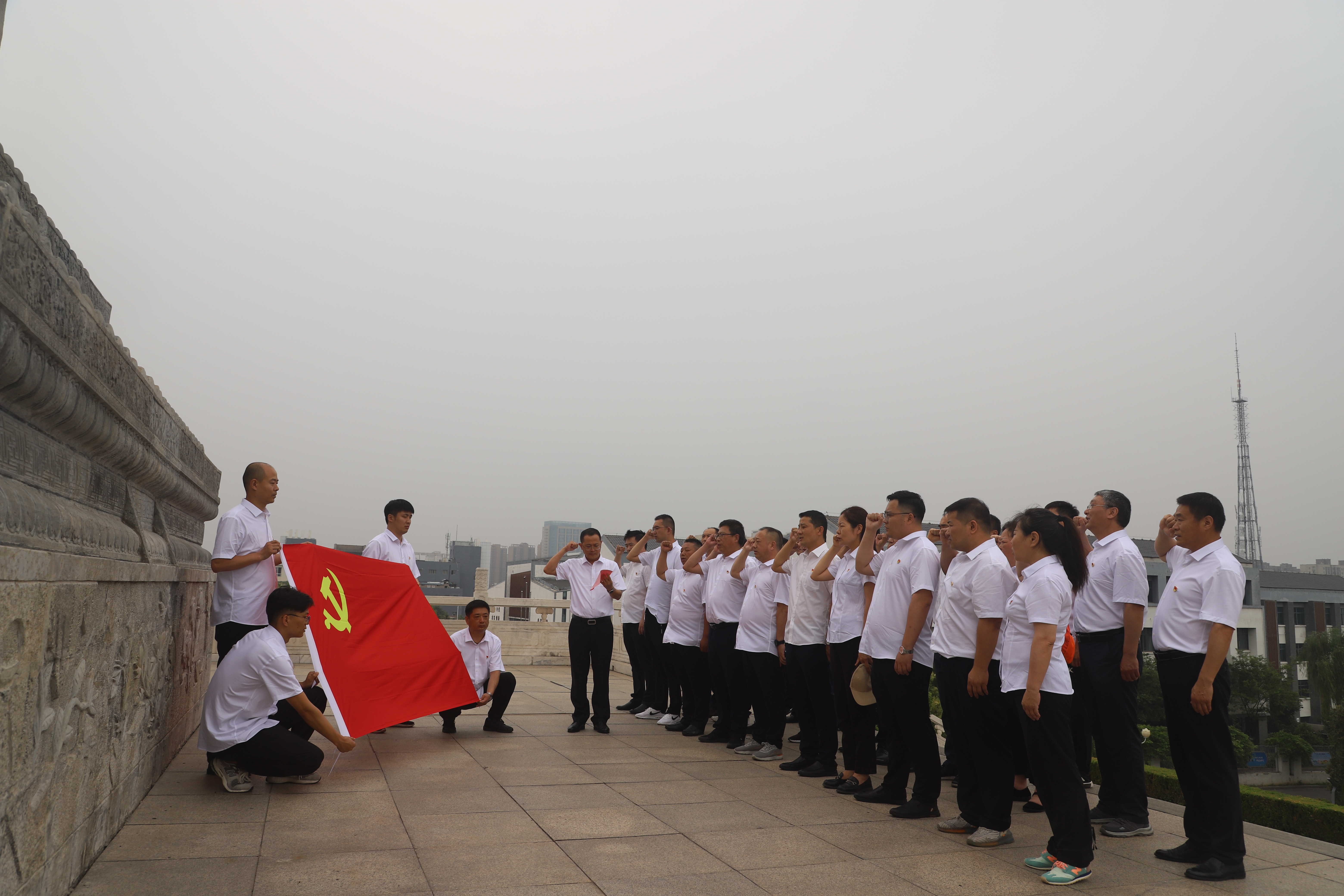 在宿北大戰紀念館內,觀看了宿遷地區革命斗爭史料,聆聽了講解員講解的戰斗英雄的故事,在一組組歷史照片和實物前大家凝神注目,回顧著陳毅等老一輩革命家運籌帷幄、決勝千里的豪放氣質,感受著當年激戰七天七夜的壯烈場景。隨后,前往宿北大戰馬陵山革命烈士紀念塔,在鮮艷的黨旗下,黨員們莊嚴宣誓,重溫了入黨誓詞。
